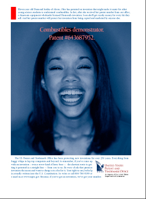 COPY: Eleven year old Diamond Suttles of Akron, Ohio has patented an invention that might make it easier for other young science students to understand combustibles. In fact, after she received her patent number from our office, a classroom equipment wholesaler licensed Diamond’s invention. Soon she’ll get royalty money for every kit they sell. And her patent number will protect her invention from being copied and marketed by anyone else.